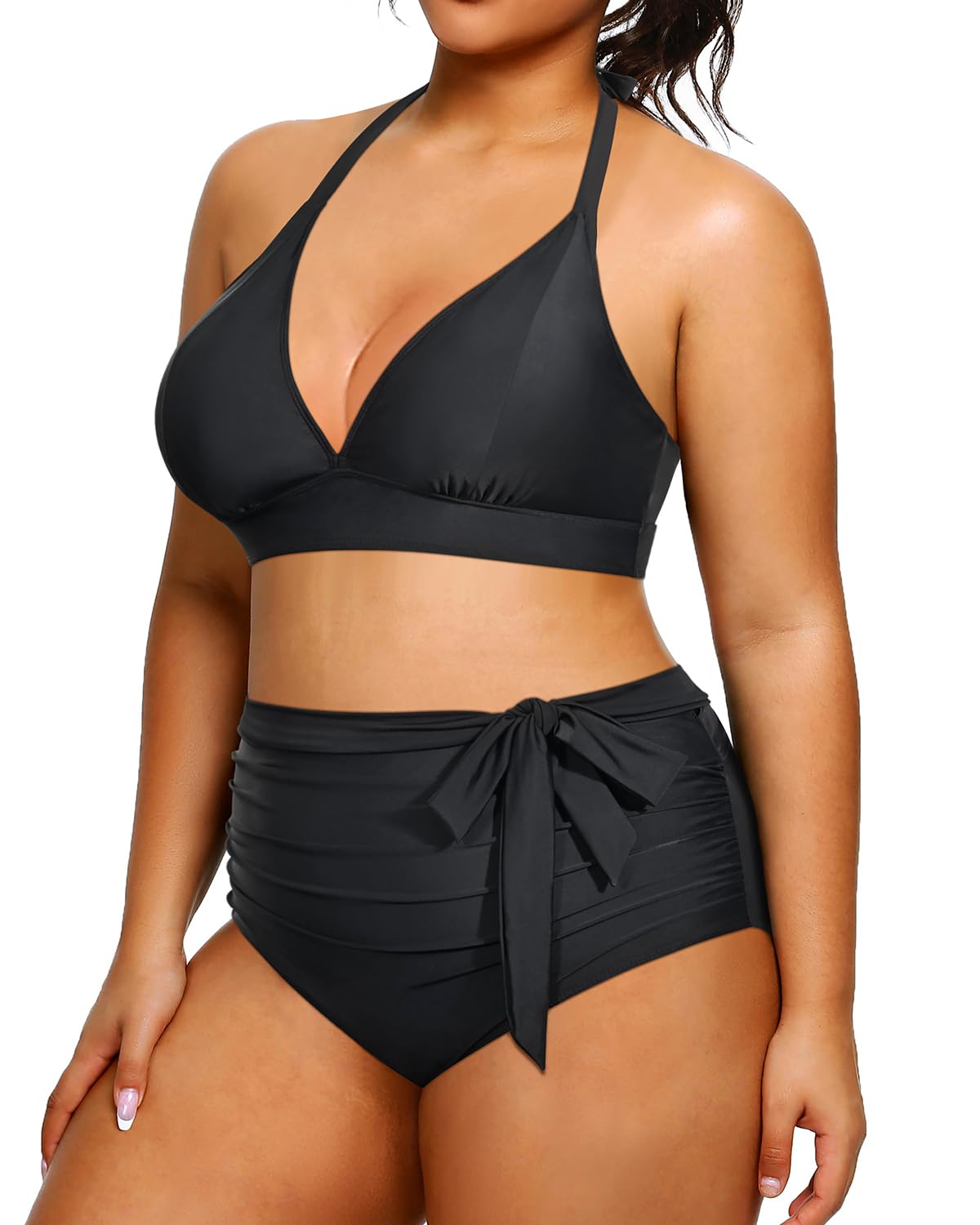 - Plus Size Bikini Set: This halter bikini top features a v neckline that accentuates your figure.