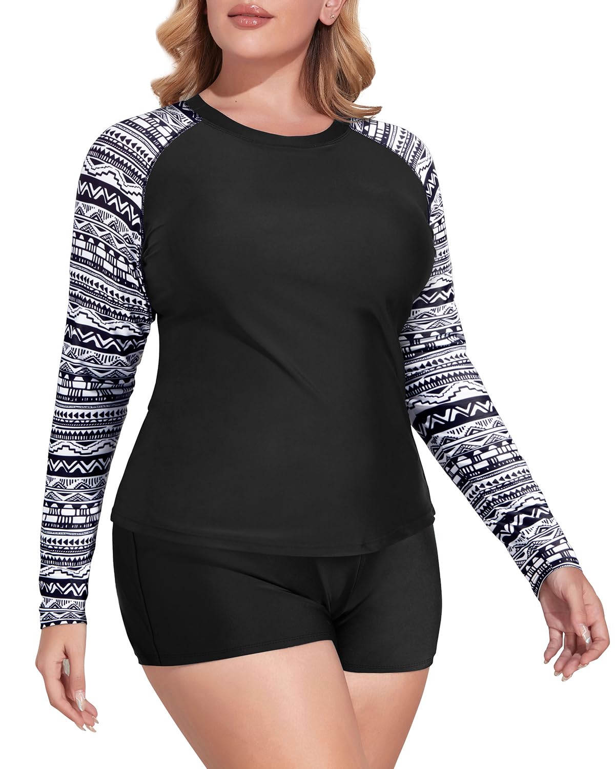- Two Piece Rash guard Swimsuit: This crew neck athletic tankini features black and geometric prints. Color block raglan sleeve matches with high waisted boyleg bottom , making it more stylish and flattering.