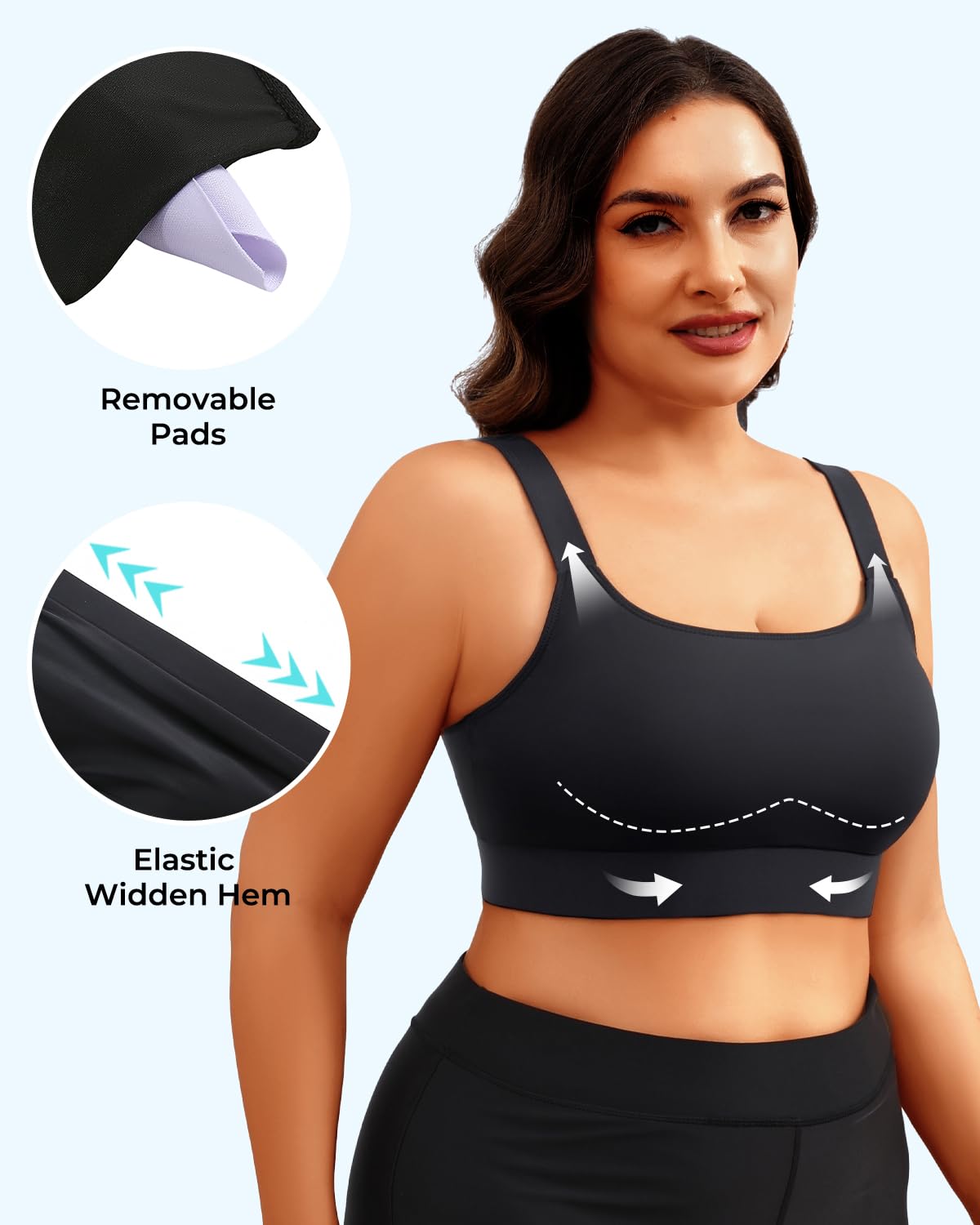 - Plus Size Sports Bra: These elegantly gathered bikini tops are designed to provide exceptional support. Designed with a scoop neck and adjustable wide straps to ensure an impeccable fit. This long lined athletic bikini top elegantly highlights your curves while providing ample chest coverage. Flaunt your charm confidently without feeling overexposed.