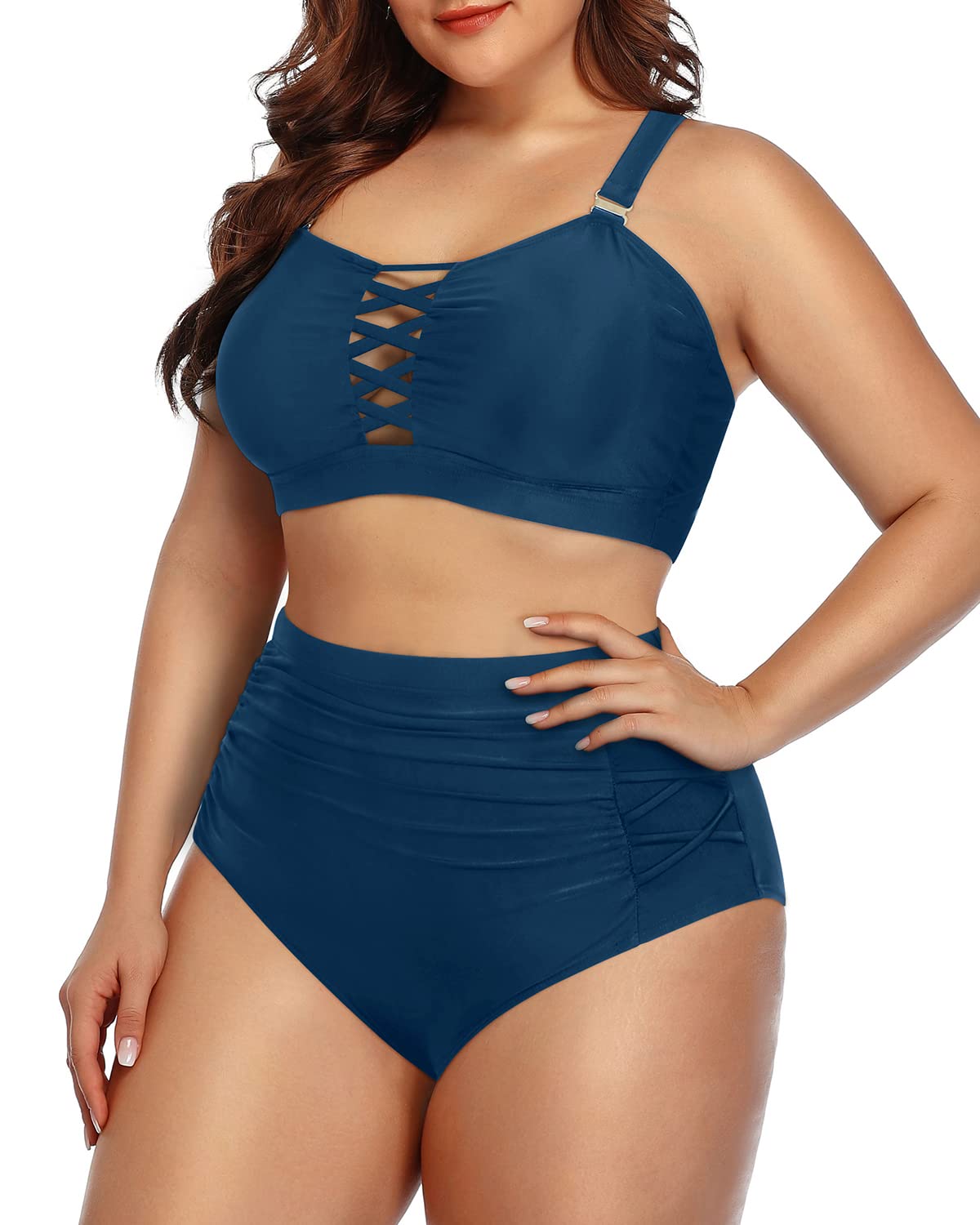 - Plus Size High Waist Bikini: High-waisted bikini bottom with side criss-cross detailing for a slimming effect. Ruching bottoms provide tummy control.