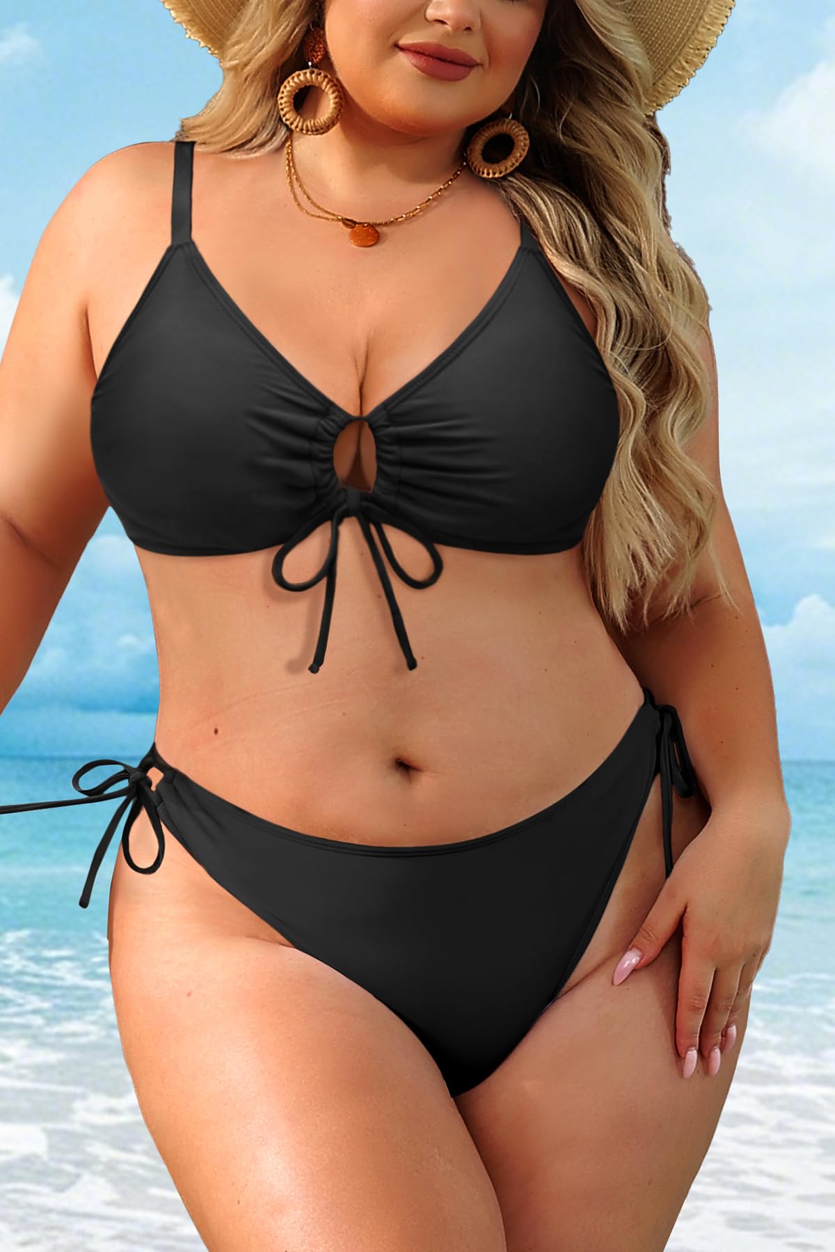 - Plus Size Two-Piece Swimsuit: This black bikini set includes a front-tie triangle top and adjustable side-tie bottoms. The design elegantly balances coverage and style versatility.