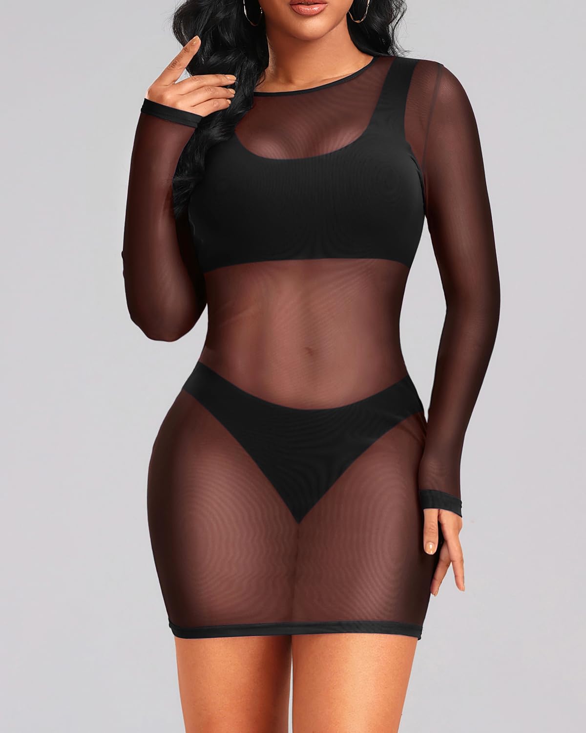 - Black sheer mesh swimsuit cover-up, see through bodycon dress, long-sleeved club outfits, stretchy see thru dress with crewneck.