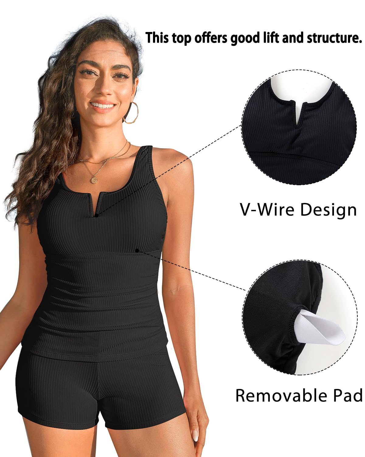 Daci Womens 2 Piece Tankini Swimsuits - Tummy Control Bathing Suit with Shorts V Wire Tankini Top Ribbed Swimwear