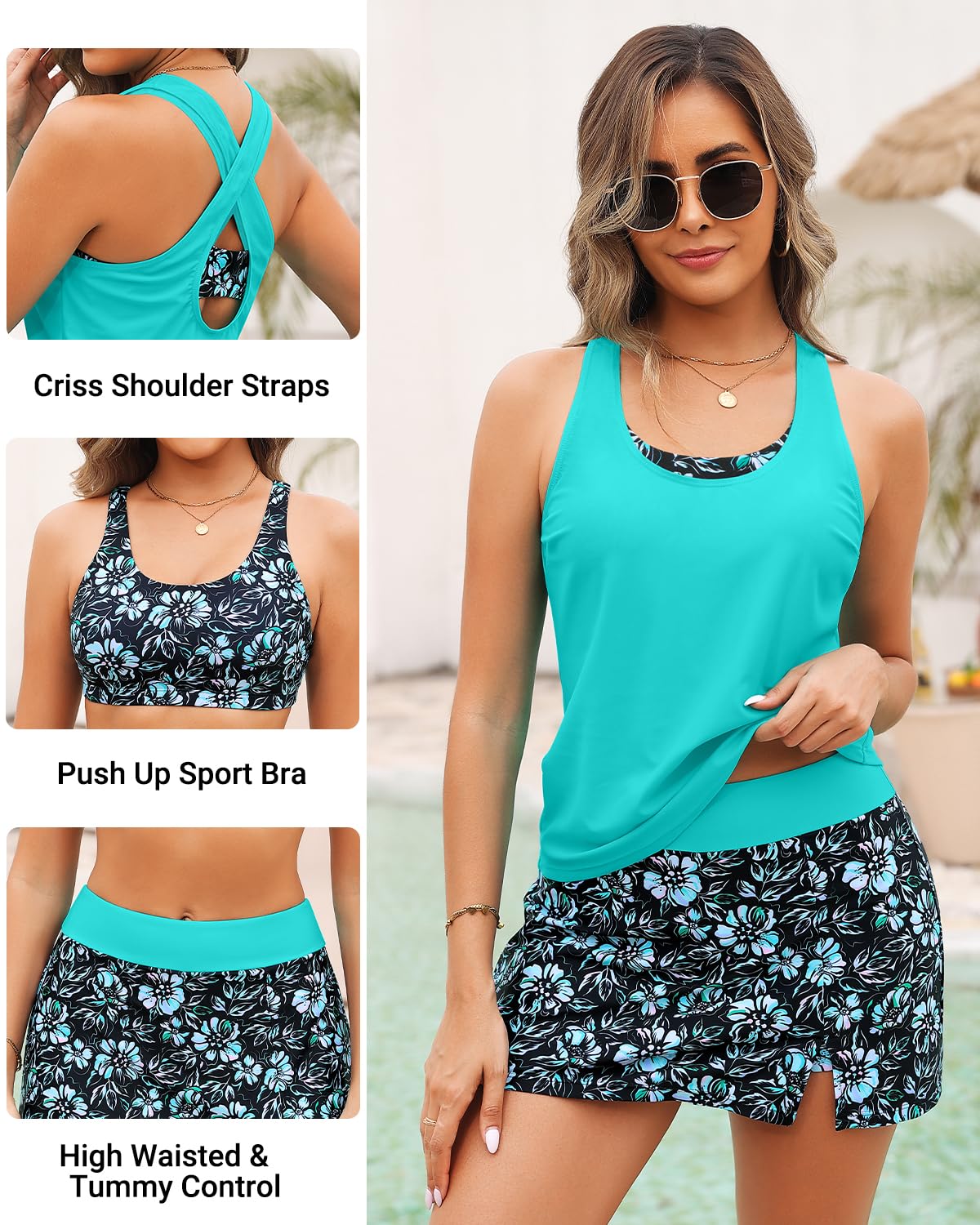 - Versatile 3 Piece Tankini Swimsuits Mix & Match: The Aqua Floral tankini set includes a swim tank top, sports bra, and a high-waisted swim skirt. Mix and match for two stylish looks—from a modest tankini to a chic bikini/skirt set.