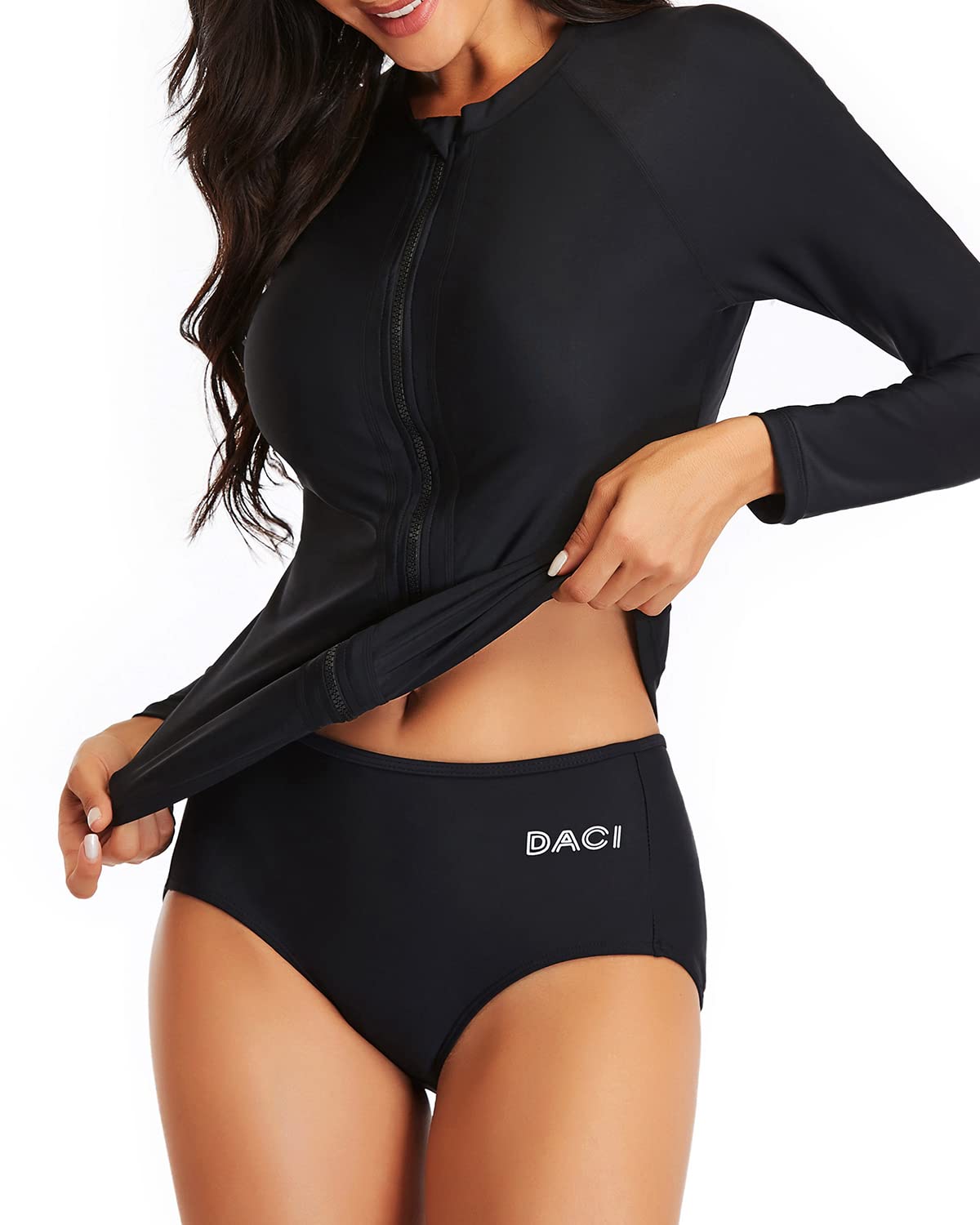 - This long sleeve full zipper 2 piece swimsuit with black swim shirt and black shorts is perfect for those who want a sporty and slimming effect.
