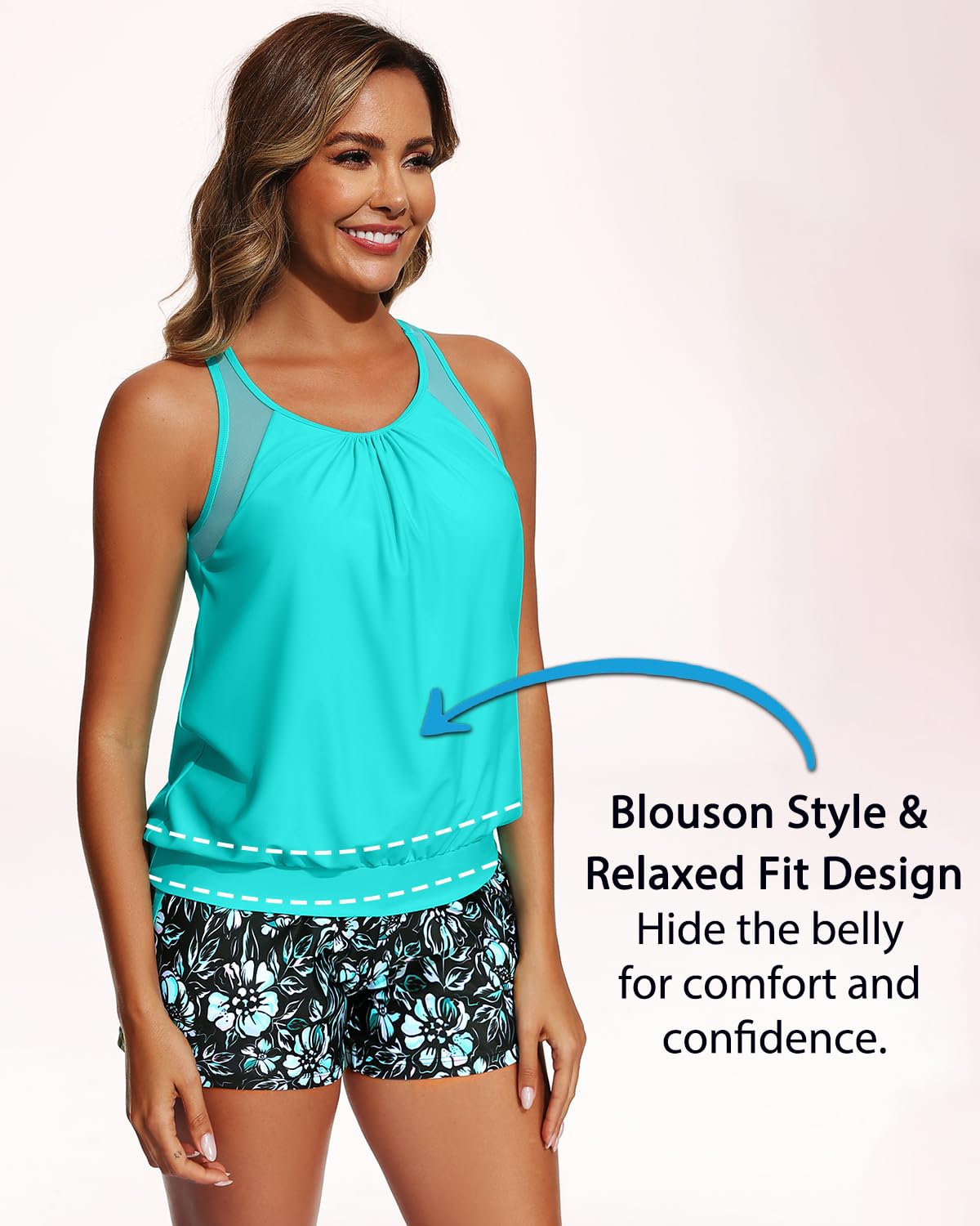 Women Blouson Tankini Swimsuit with Shorts - 2 Piece Tummy Control Bathing Suit Modest Mesh Racerback Top with Pockets 2026