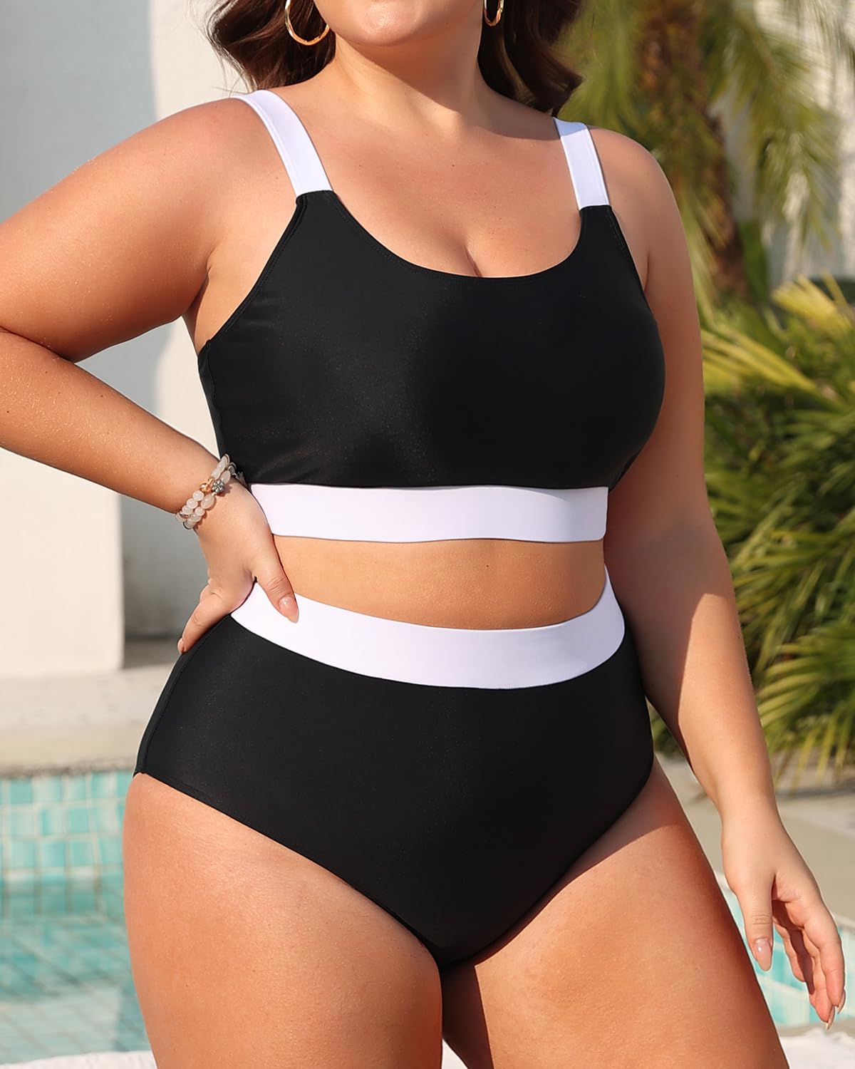 - Plus Size Two-Piece Swimsuit: This stylish bikini set features a athletic scoop neck top and classic bottoms, offering both comfort and elegance. Ideal for swimming, surfing, beach outings, tropical vacations, and even yoga.